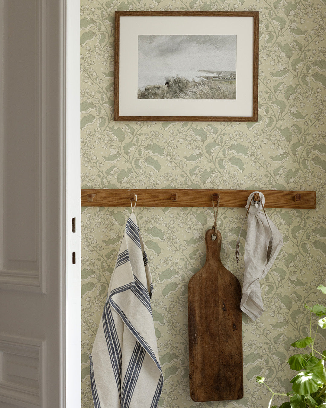 Syrén is a pleasantly beige wallpaper where the fragrant lilac bush, with its delicate blossoms, spreads gracefully across the wall. It transports you to bright, tranquil summer evenings when the sweet scent of flowers fills the air. A moment to pause, cherish, and remember. With its monochrome palette of beige tones, the wallpaper brings a serene and calming impression to the room.