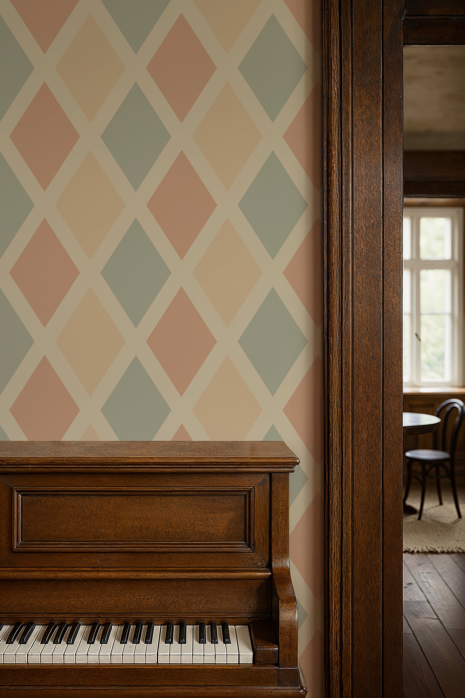 This lively and joyful pattern brings instant cheer to any room. Bursting with colour and character, it adds a playful rhythm to your walls without overpowering the space. Whether used across a full room or as a feature wall, its mix of tones and trellis shapes creates a happy backdrop that makes everything around it feel brighter.