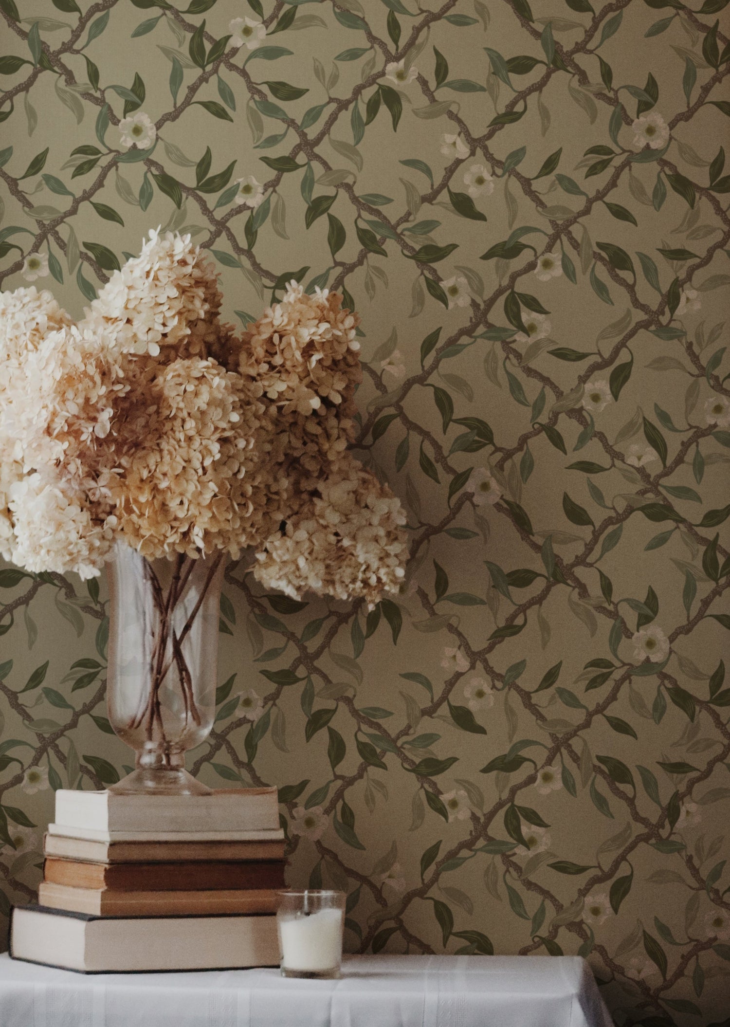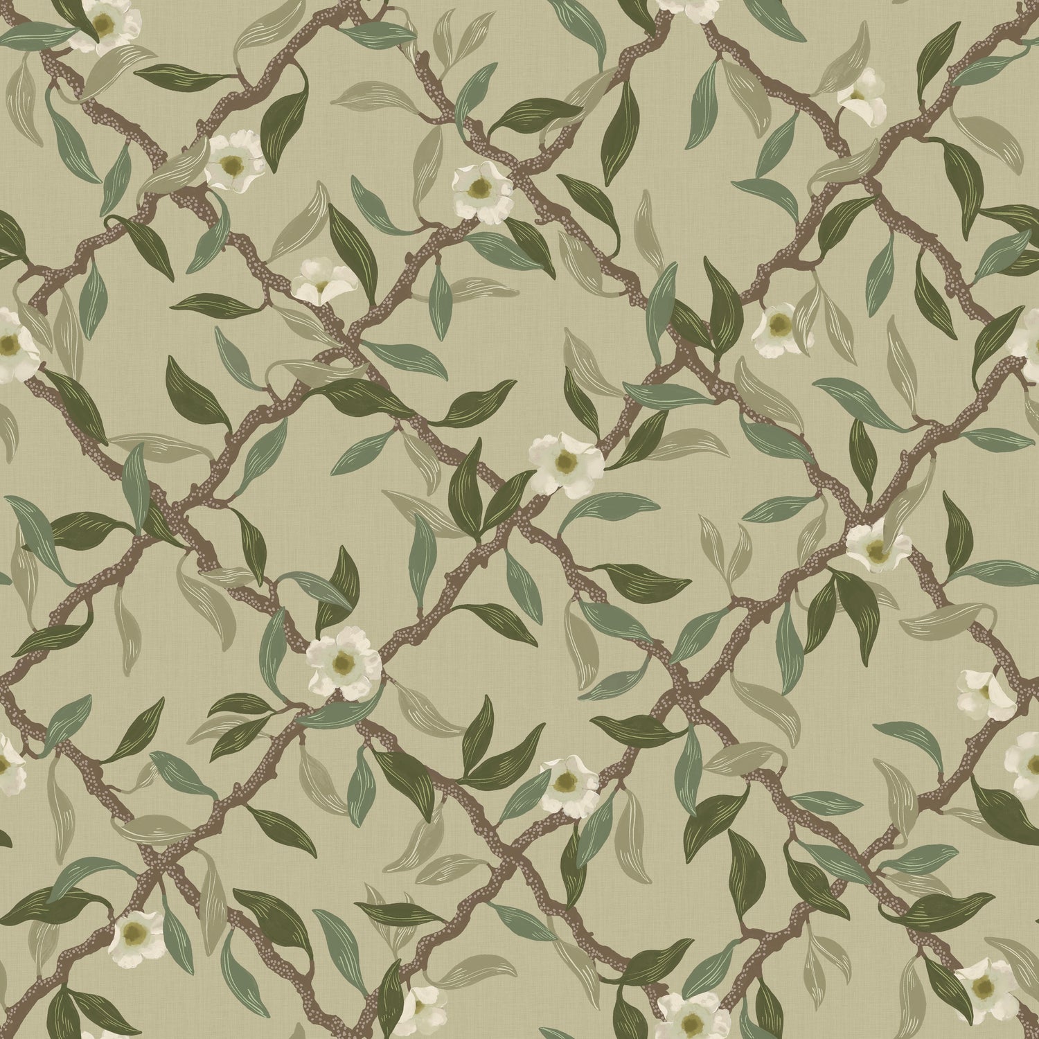 The Espalier wallpaper is available in multiple colour schemes. Here you see the wallpaper in sage green.