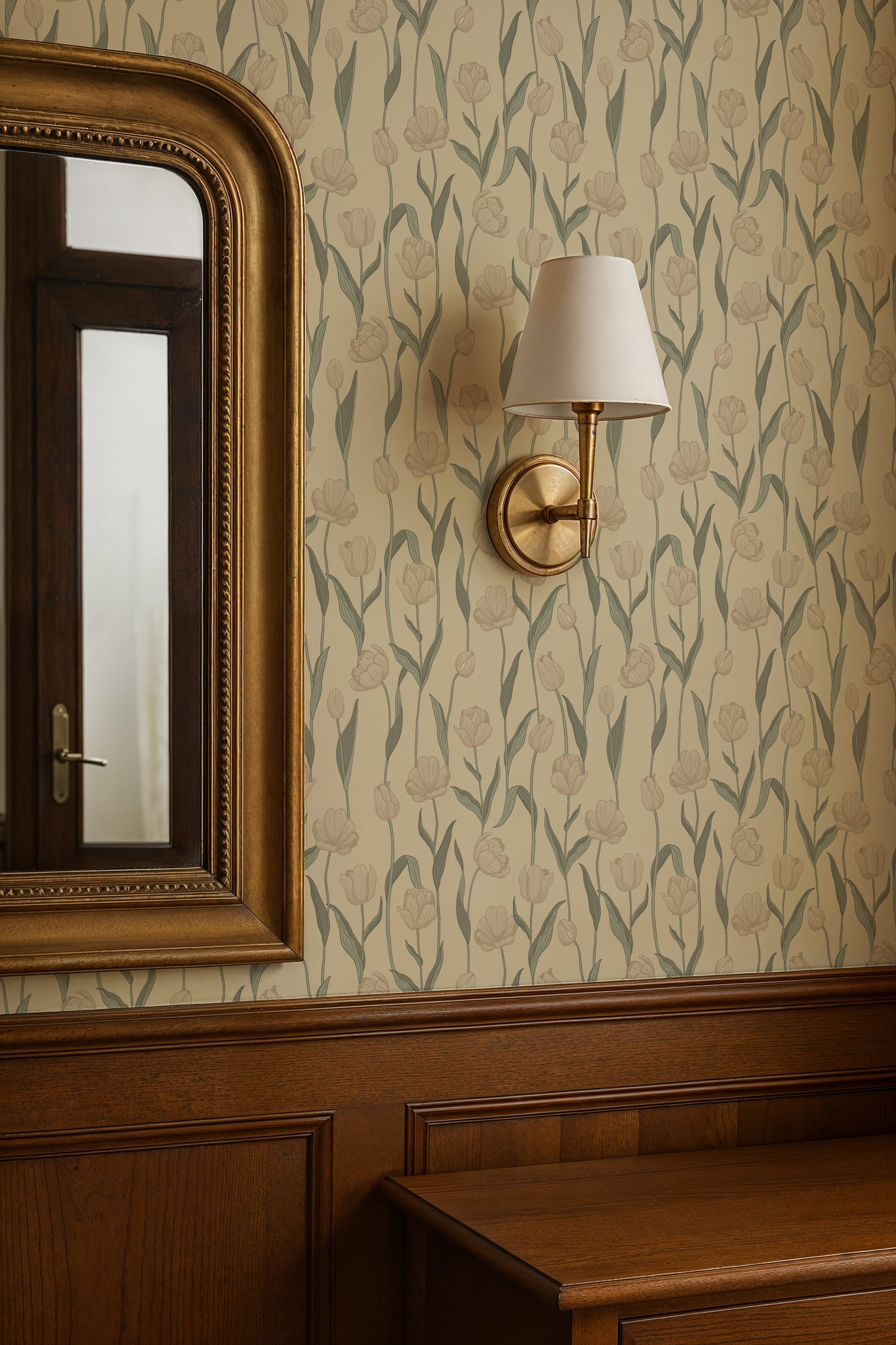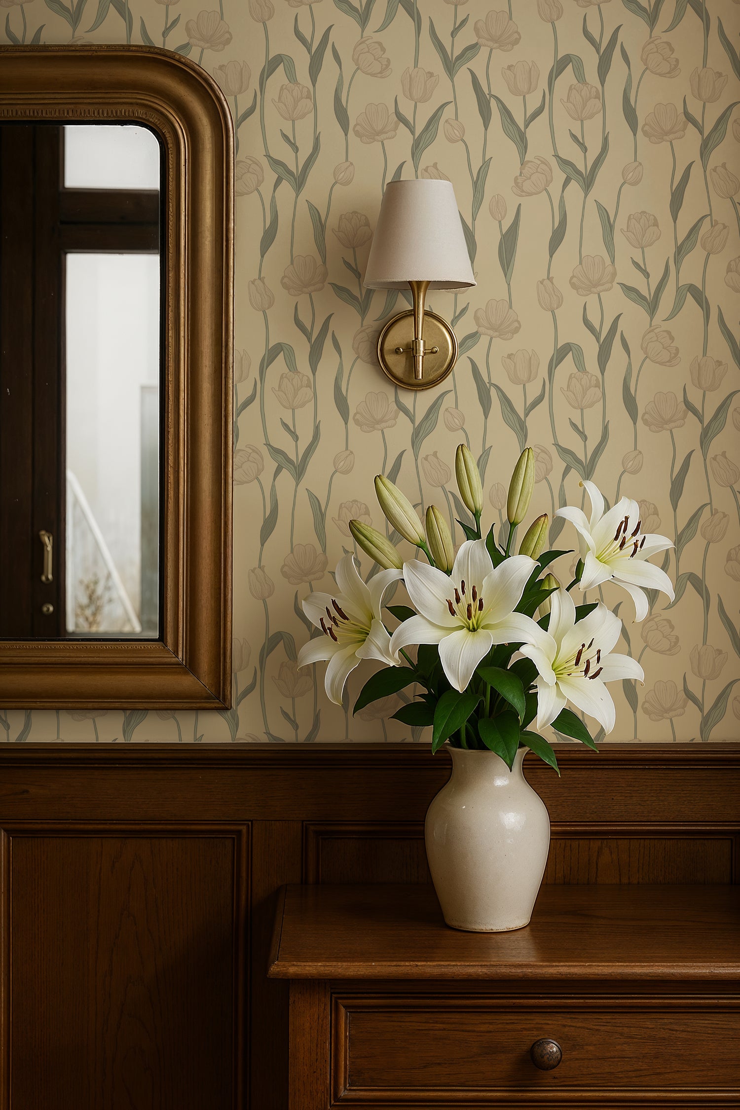 Bring the essence of Amsterdam’s iconic tulip fields into your home with the Summer Gray Wallpaper - Fjädra. This hand-painted design captures the delicate beauty of springtime tulips in a soothing pastel palette, creating a serene and inviting atmosphere. Perfect for adding a touch of elegance and seasonal charm to any room.