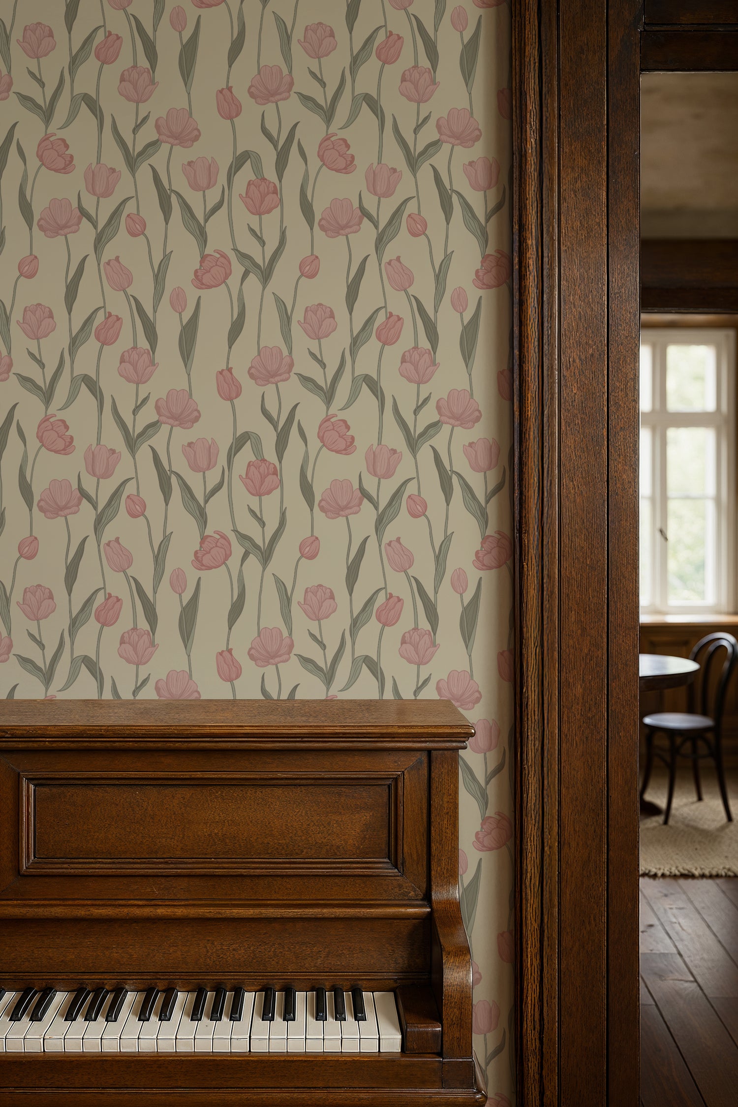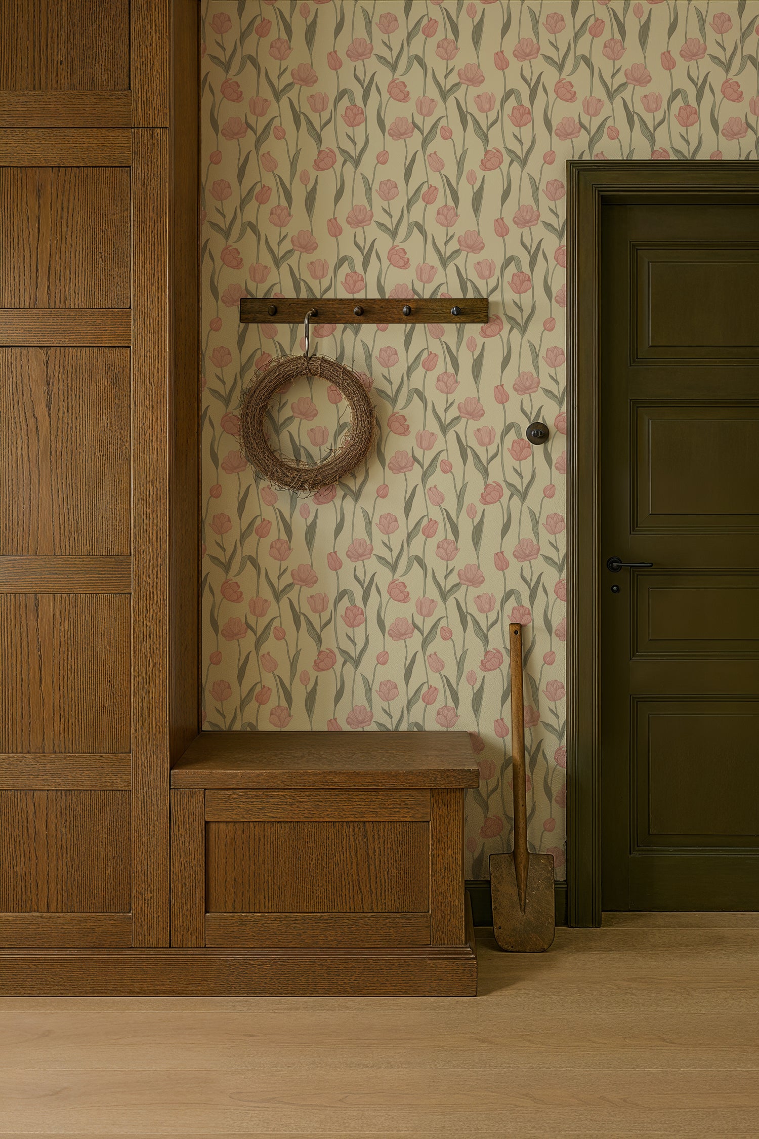 Bring the essence of Amsterdam’s iconic tulip fields into your home with the Summer Gray Wallpaper - Fjädra. This hand-painted design captures the delicate beauty of springtime tulips in a soothing pastel palette, creating a serene and inviting atmosphere. Perfect for adding a touch of elegance and seasonal charm to any room.