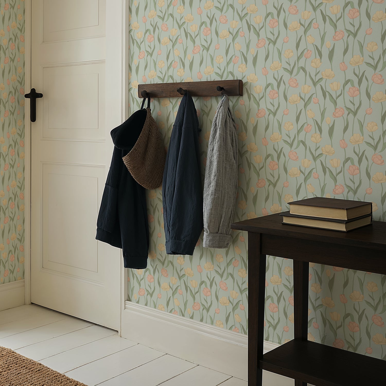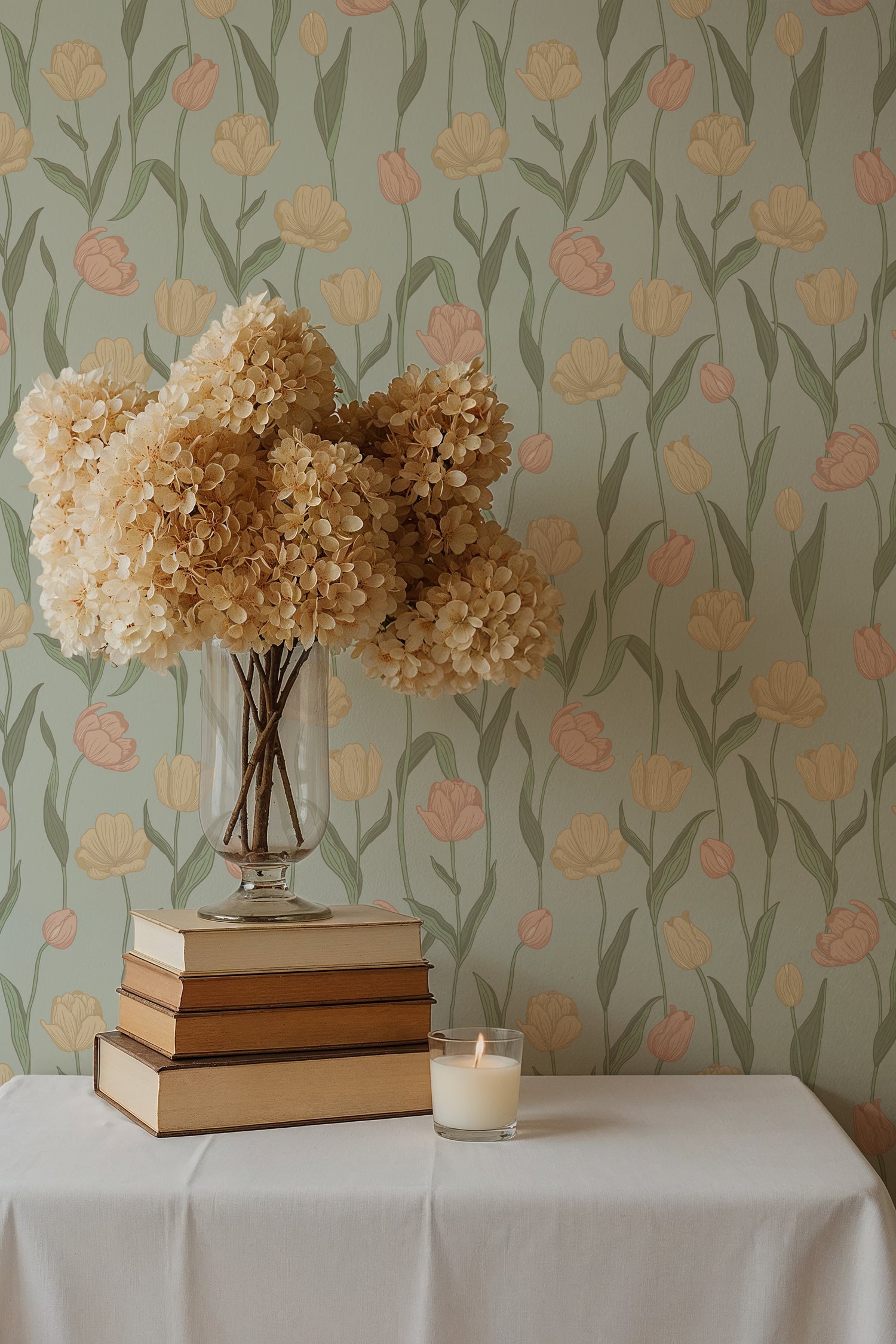 Bring the essence of Amsterdam’s iconic tulip fields into your home with the Summer Gray Wallpaper - Fjädra. This hand-painted design captures the delicate beauty of springtime tulips in a soothing pastel palette, creating a serene and inviting atmosphere. Perfect for adding a touch of elegance and seasonal charm to any room.