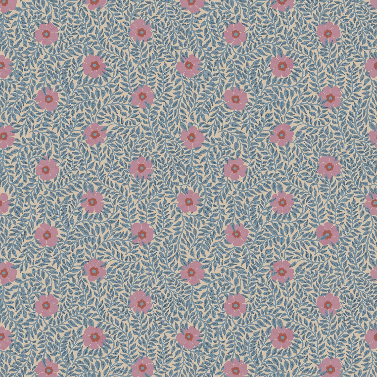 The Kicki wallpaper is available in multiple colour schemes. Here you see the wallpaper with blue leaves with pink petals.