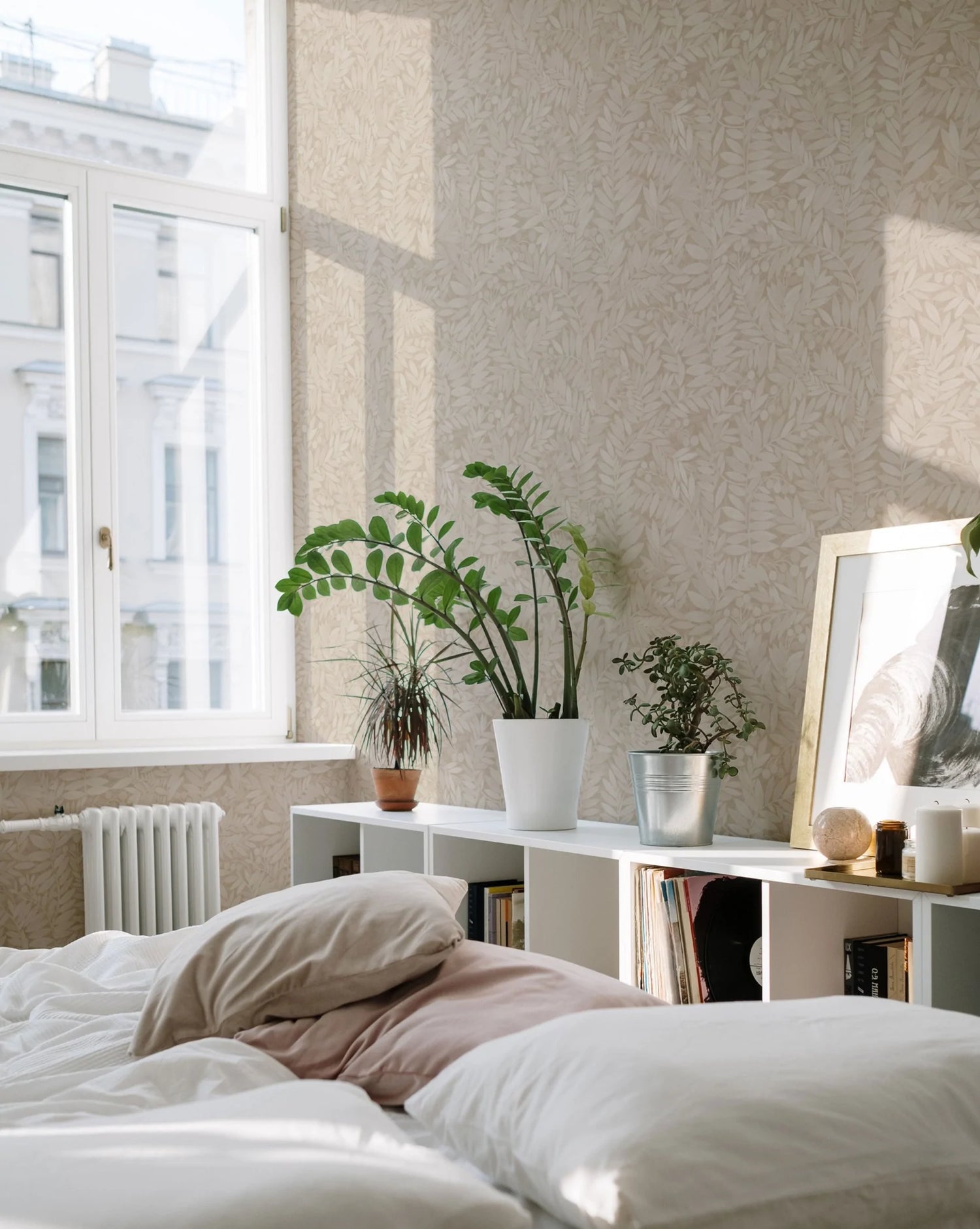 Het Eve-behang is verkrijgbaar in vier kleuren - Sand, Bodem, Rose, Evergreen.