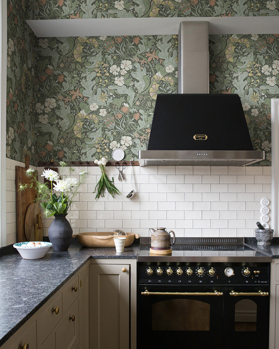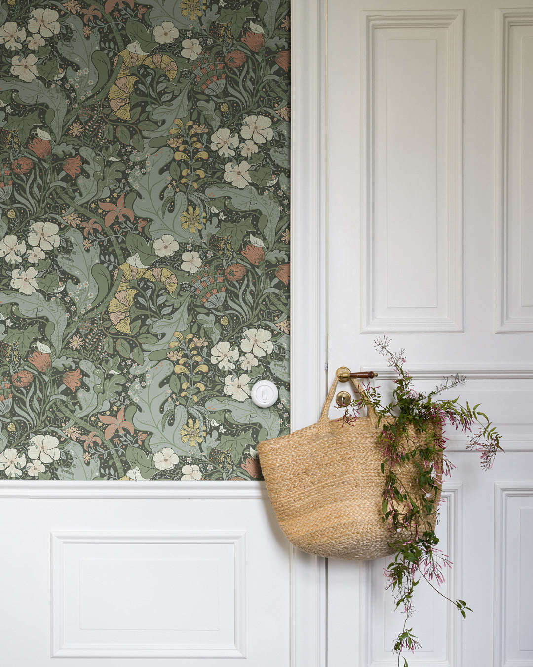 On the wallpaper Elise you will find many beautiful Swedish region flowers. Can you find them all? The wallpaper has a white background with a beautiful pattern in shades of green, blue, yellow and orange.