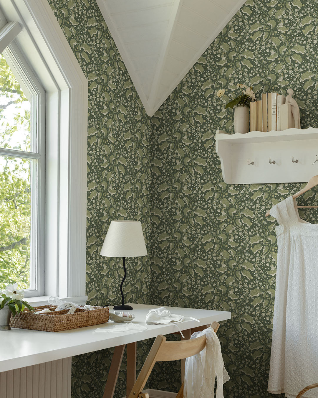 Syrén ist eine angenehm beige Tapete, auf der der duftende Fliederstrauch mit seinen zarten Blüten anmutig über die Wand zieht. Sie entführt Sie in helle, ruhige Sommerabende, wenn der süße Duft der Blumen die Luft erfüllt. Ein Moment zum Innehalten, Genießen und Erinnern. Mit ihrer monochromen Palette aus Beigetönen vermittelt die Tapete einen ruhigen und beruhigenden Eindruck im Raum.