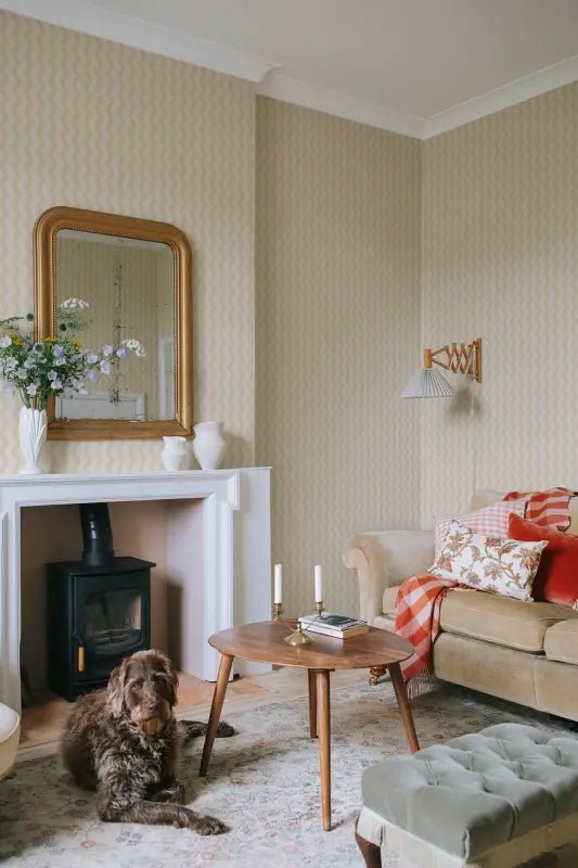 Be enchanted by it Erik Indigo Blue Wallpaper van Sandberg, designed by Karolina Kroon. This unique wallpaper takes you to the coast, where the waves gently hit the water and create a relaxing atmosphere. The friendly and contemporary design combines a blue color scheme with beautiful blue shades, subtly accentuated by golden dots. The result is a wallpaper with both a sense of humor and timeless class, perfect for the nursery or baby room.